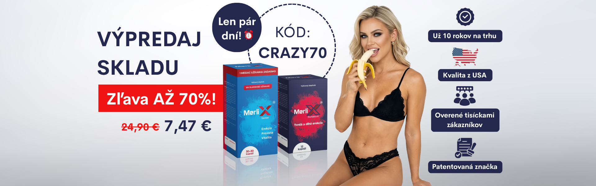 Tento produkt z USA, ktorý je dlhé roky úspešne používaný na podporu erekcie a zlepšenie sexuálneho zdravia, je konečne dostupný už aj na Slovensku. Problémy s erekciou trápia veľké množstvo mužov. Ak aj vy patríte medzi nich, siahnite po výživovom doplnku MerliX. Stačí užiť 1 tabletku MerliX Perfektum pár minút pred sexom a budete v posteli znovu dominantný a silný milenec. V ponuke značky nájdete aj variantu Senior, ktorá je určená pre starších mužov na dlhodobé pravidelné užívanie. S tabletkami MerliX Senior dosiahnete celkové zlepšenie sexuálneho zdravia a výkonnosti už za pár týždňov užívania doplnku.
